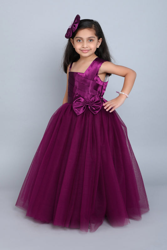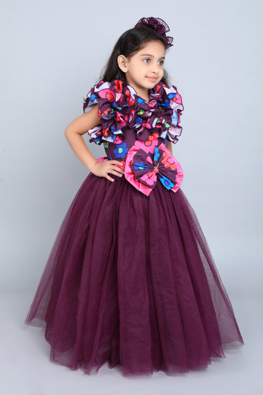 New ArrivalFloral Ruffle and Bow Gown -Burgundy