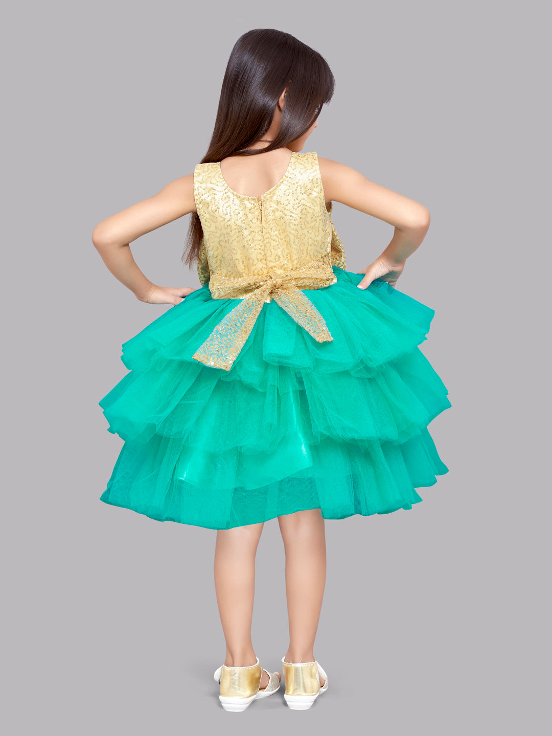 Sleeveless Dress ,Crinoline layer & lining within ,Zipper back closure w/ black tie back sash,Knee length ,Sequins Bodice,Irremovable Bow on waist