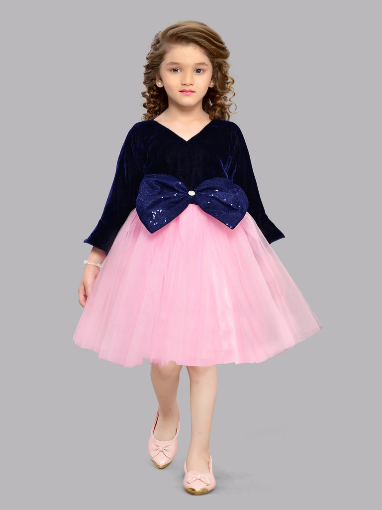 V Neck Velvet Bodice full Sleeves Poet Sleeves flair dress attached Bow center waist tie back sash Child Friendly Lining Washcare : Dry Clean Only |