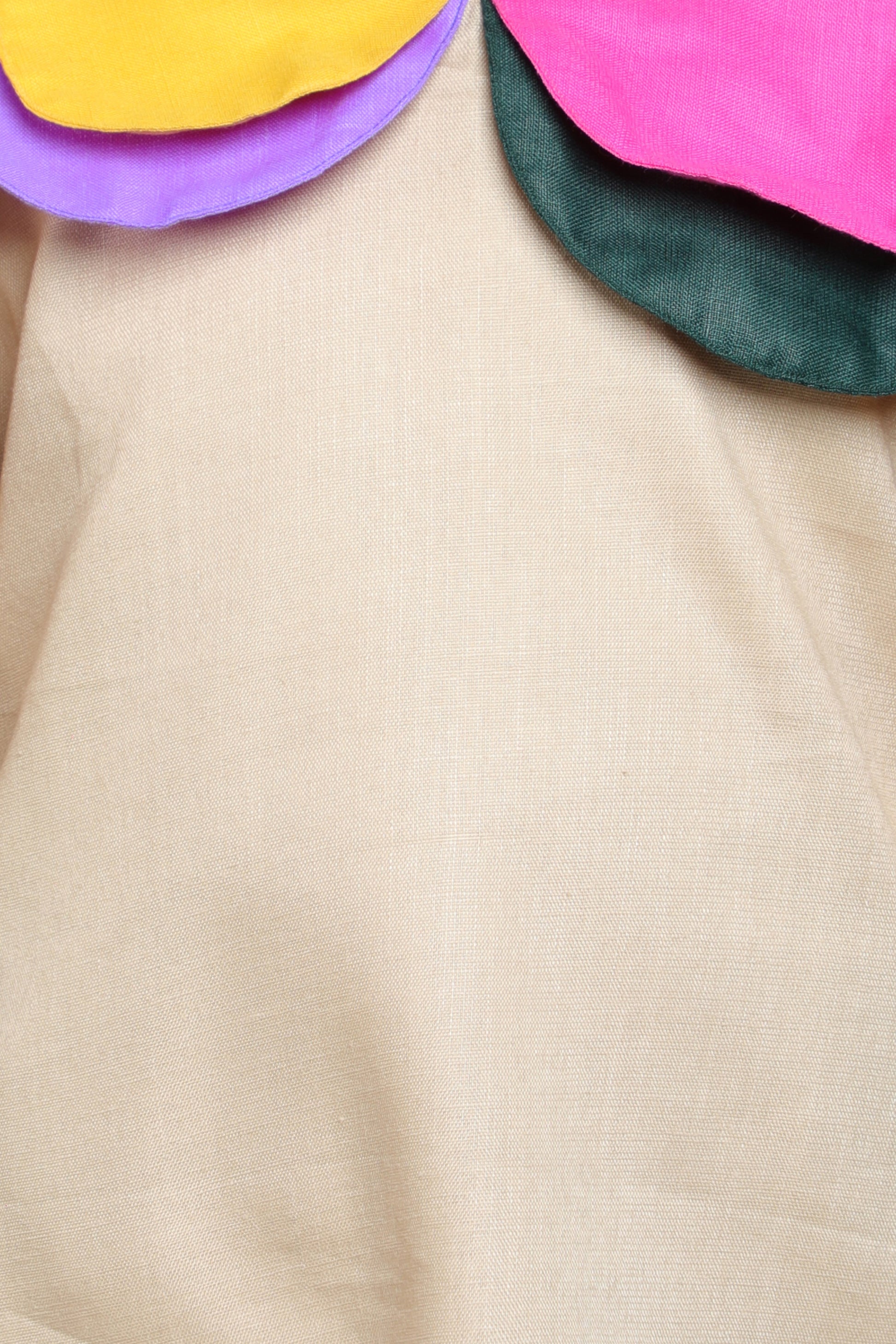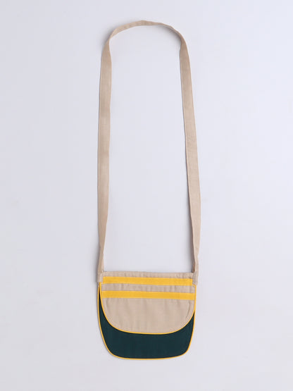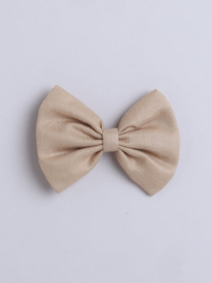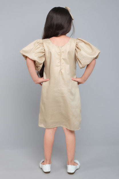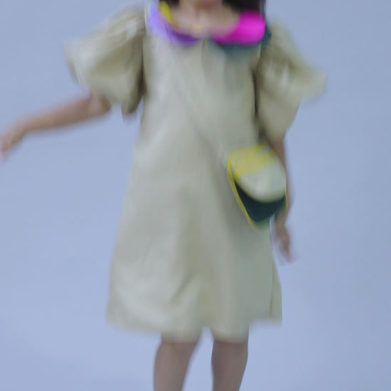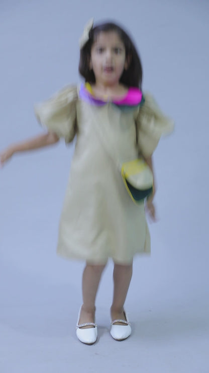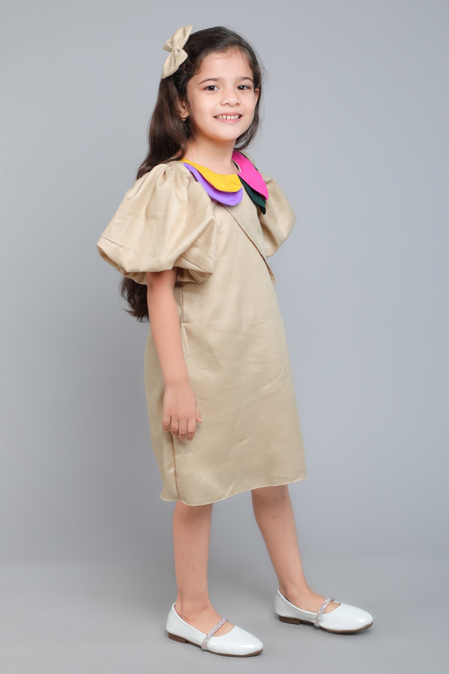 Puff Sleeves Colorblock Collar Cotton Dress with Matching Sling and Bow Clip -Beige