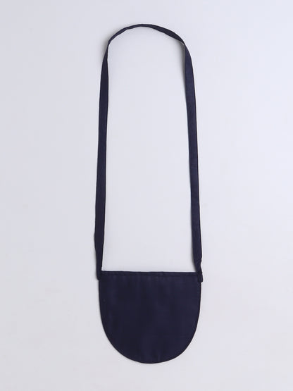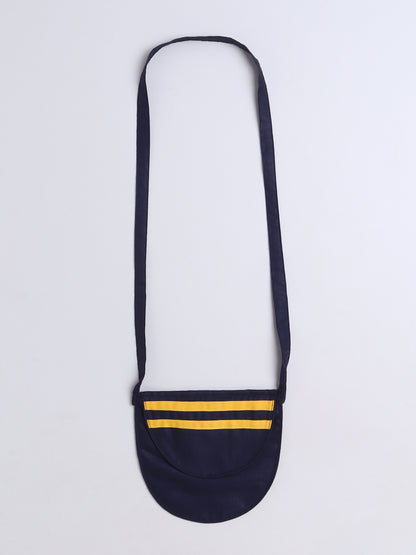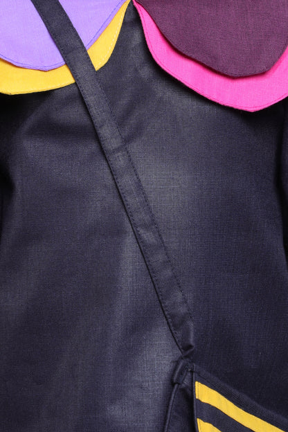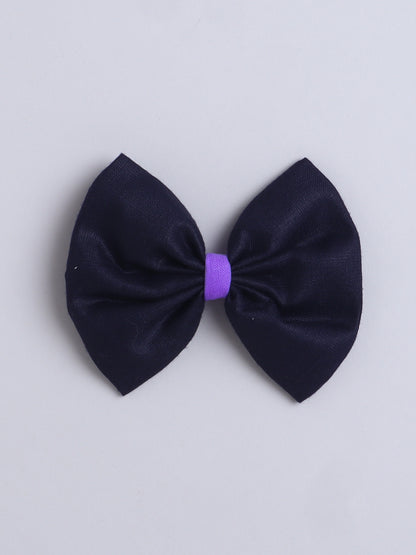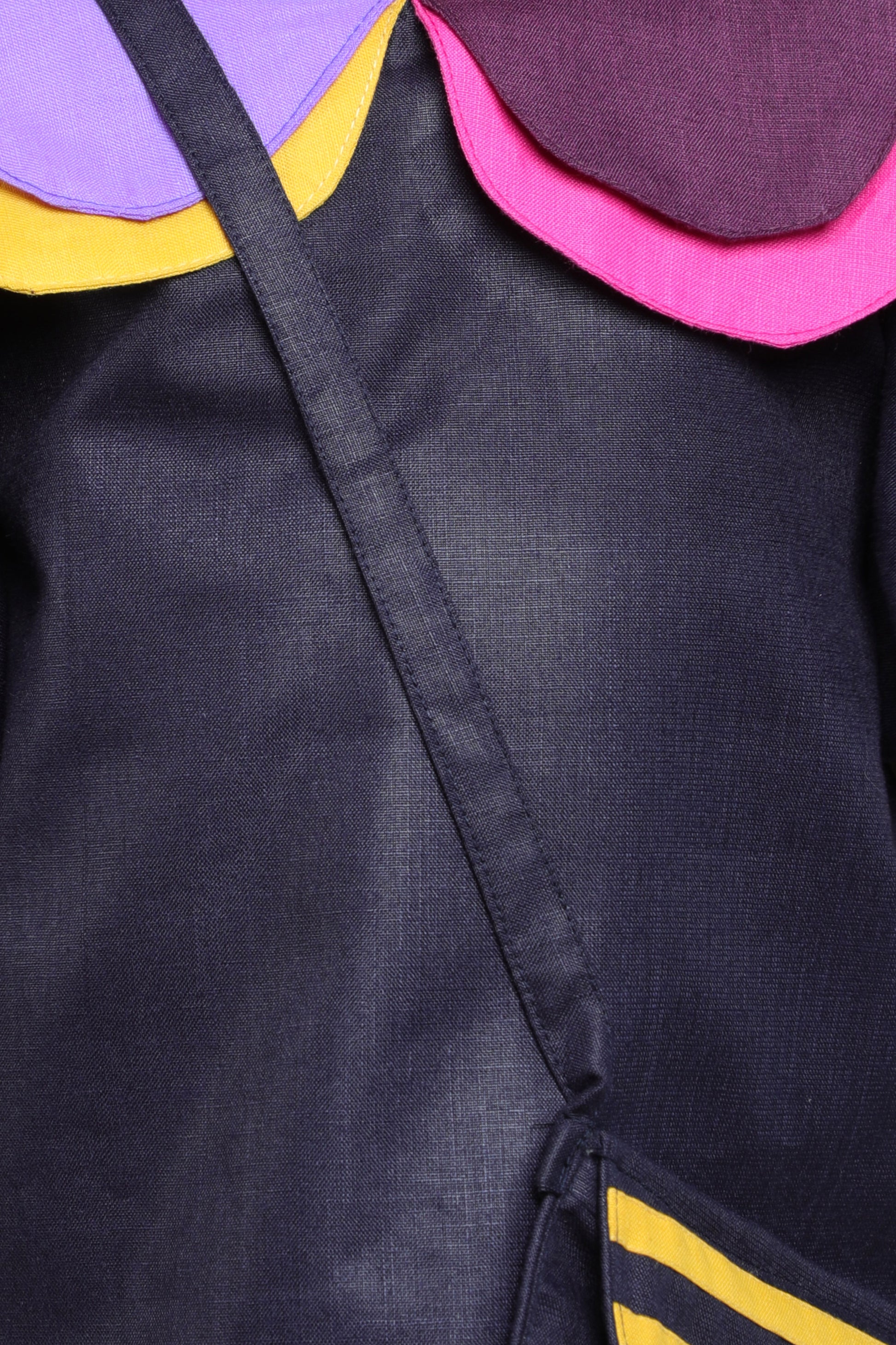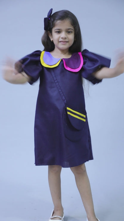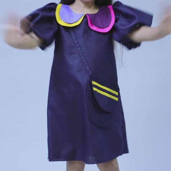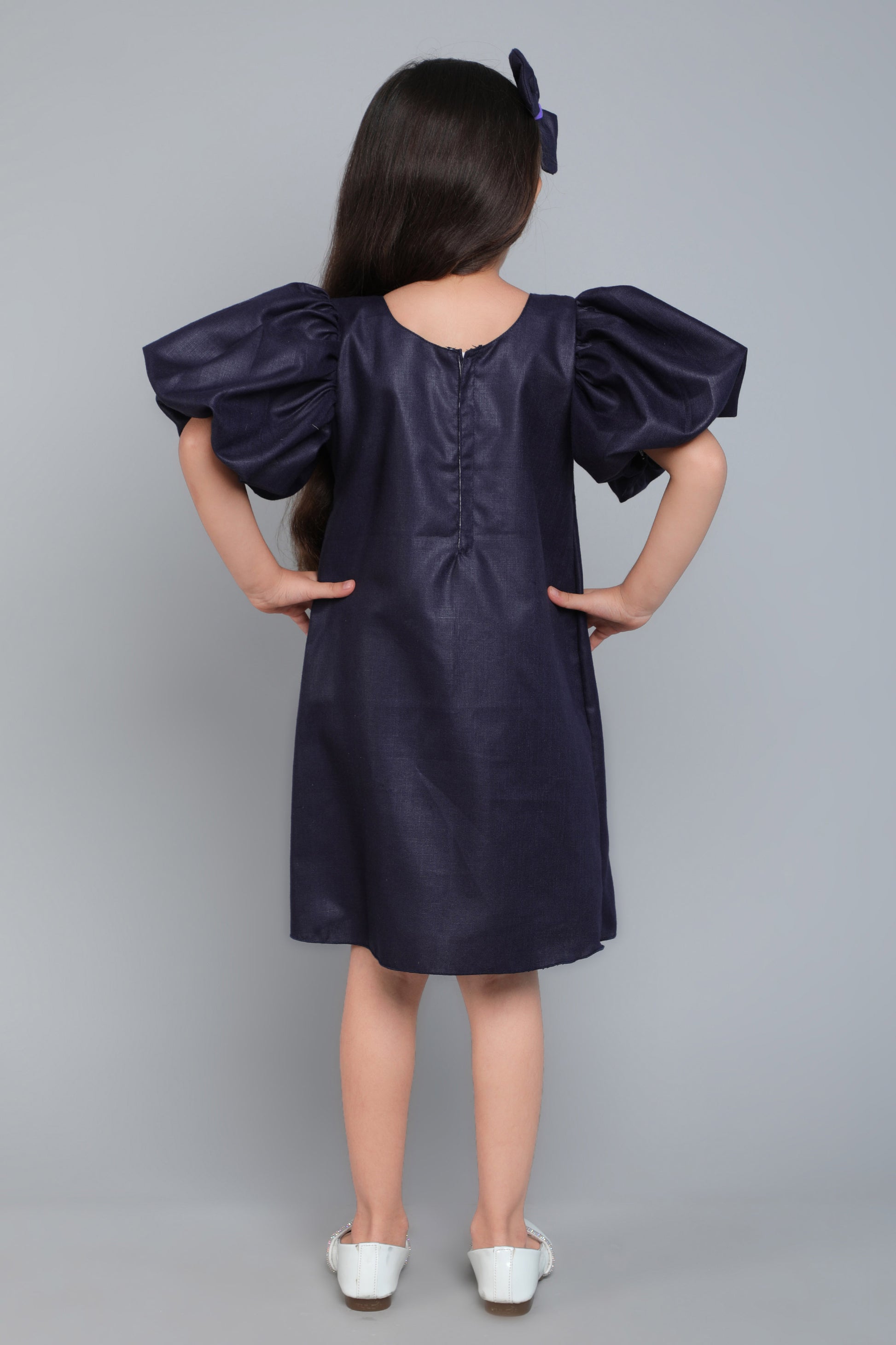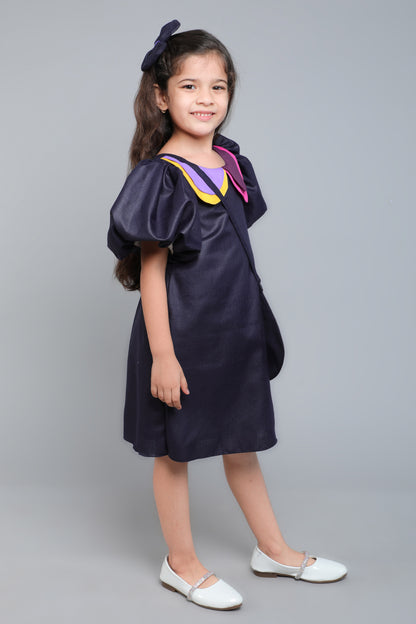 Puff Sleeves Colorblock Collar Cotton Dress with Matching Sling and Bow Clip - Navy Blue