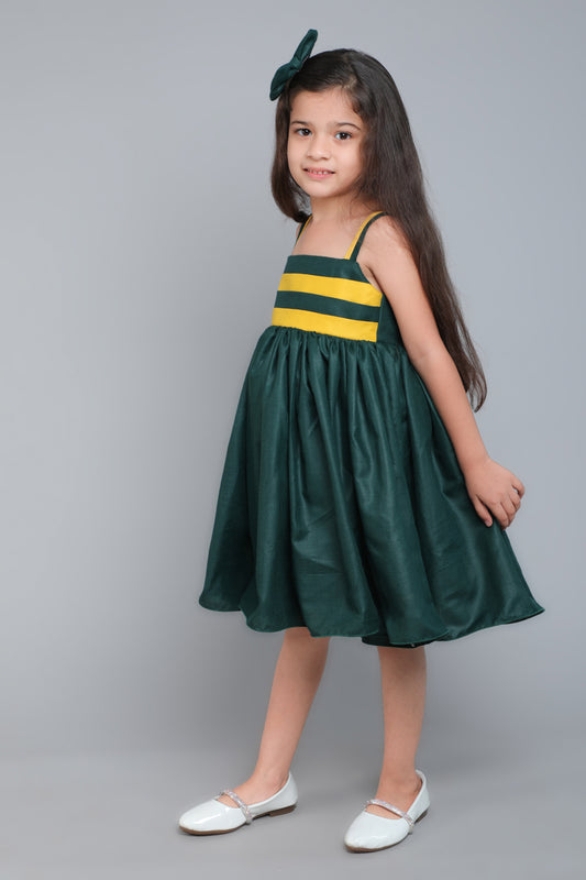 Colorblock Spaghetti Dress with Matching Bow Clip - Green & Yellow