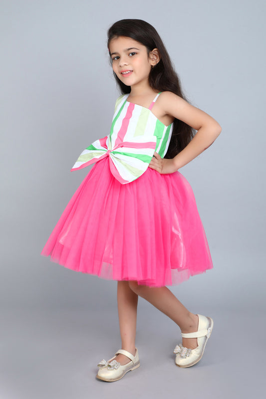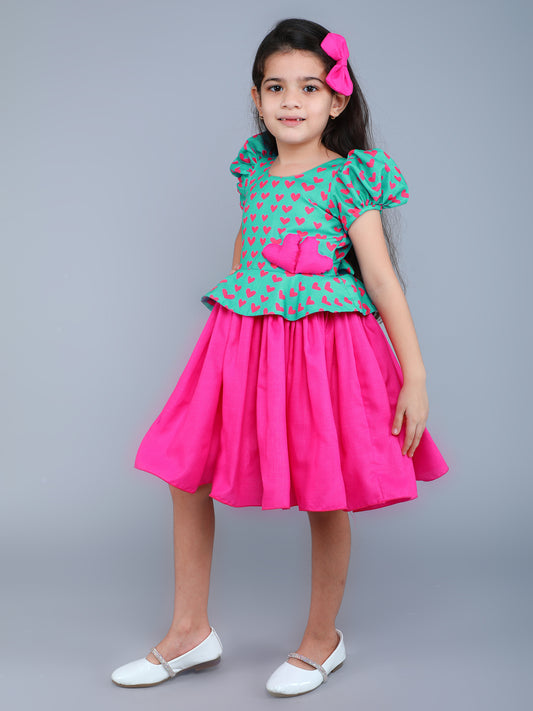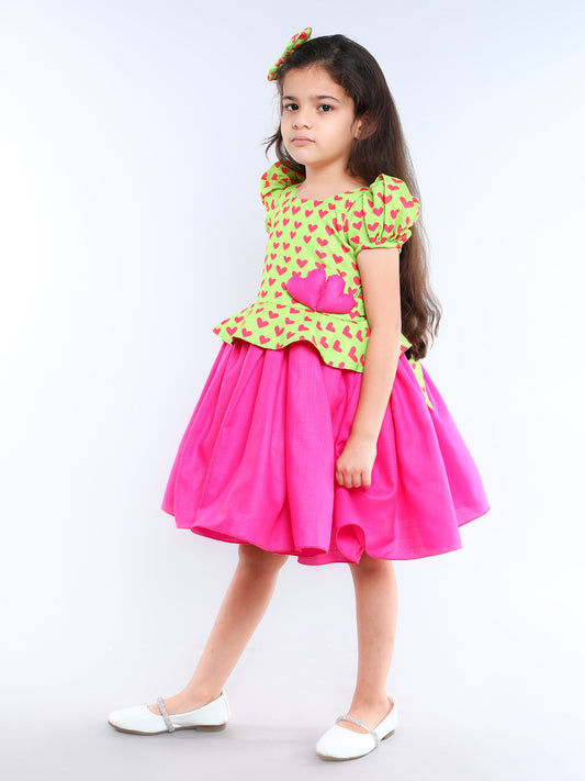 Cotton Heart Peplum Fit & Flare Dress with Matching Clip - Lime & Pink