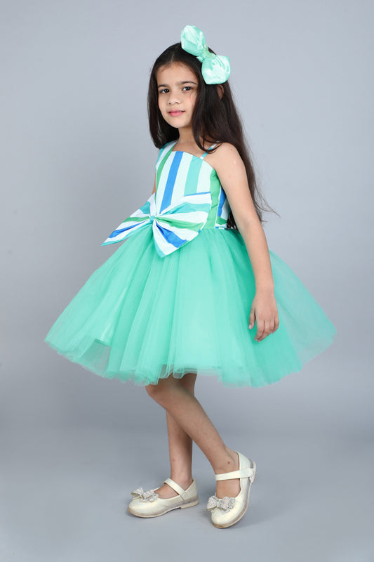 Cotton One Shoulder Stripes Bow Dress- Aqua