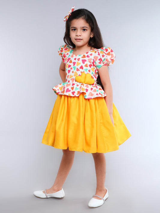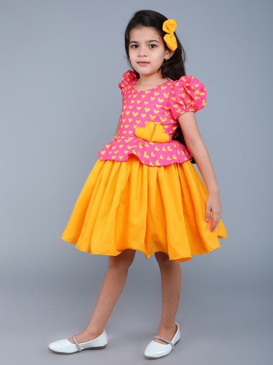 Cotton Heart Peplum Fit & Flare Dress with Matching Clip -Pink&Yellow