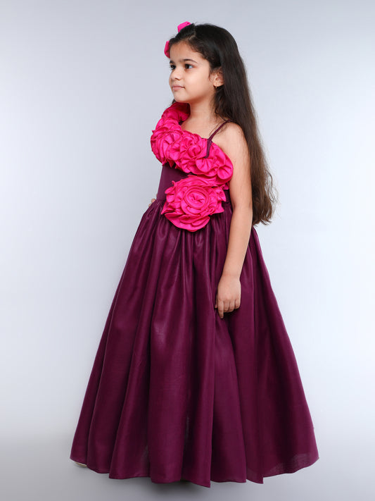 ColorBlock Ruffled Neck Cotton Gown - Burgundy