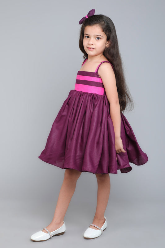 Colorblock Spaghetti Dress with Matching Bow Clip -Burgundy & Pink