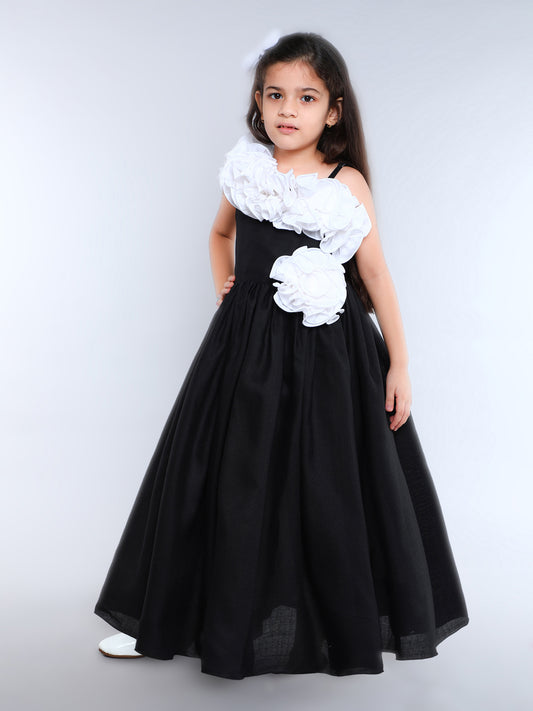 ColorBlock Ruffled Neck Cotton Gown With Matching Clip - Black