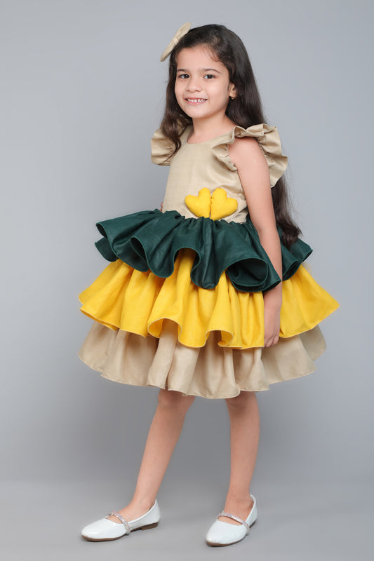 Colorblock Cotton Layered Dress with Matching Bow Clip - Beige