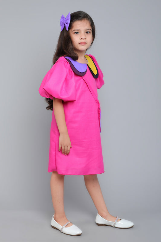 Puff Sleeves Colorblock Collar Cotton Dress with Matching Sling and Bow Clip - Pink