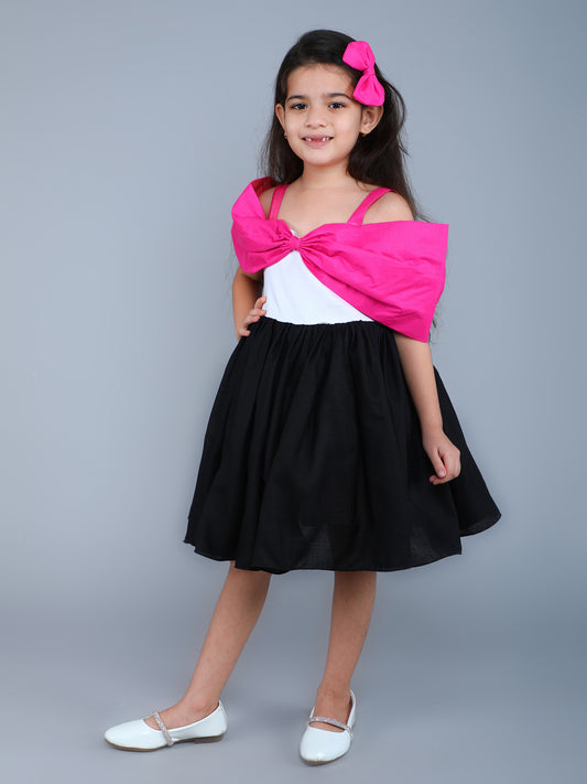 Color Block Fit and Flare Bow Dress with Matching Clip- Pink& Black