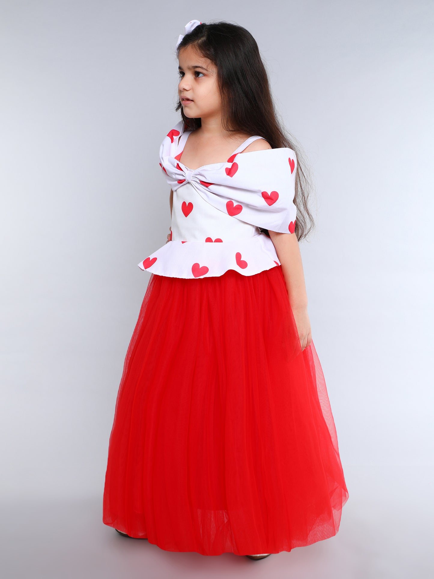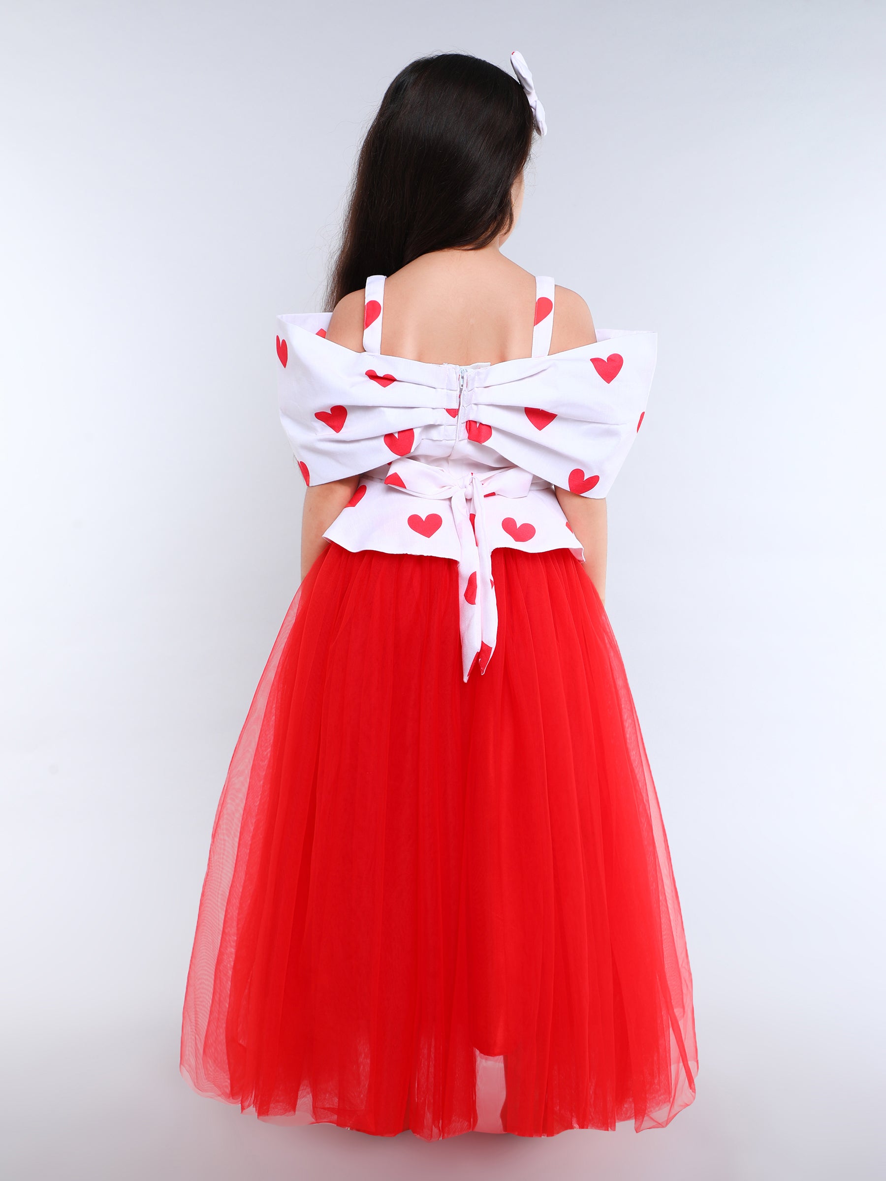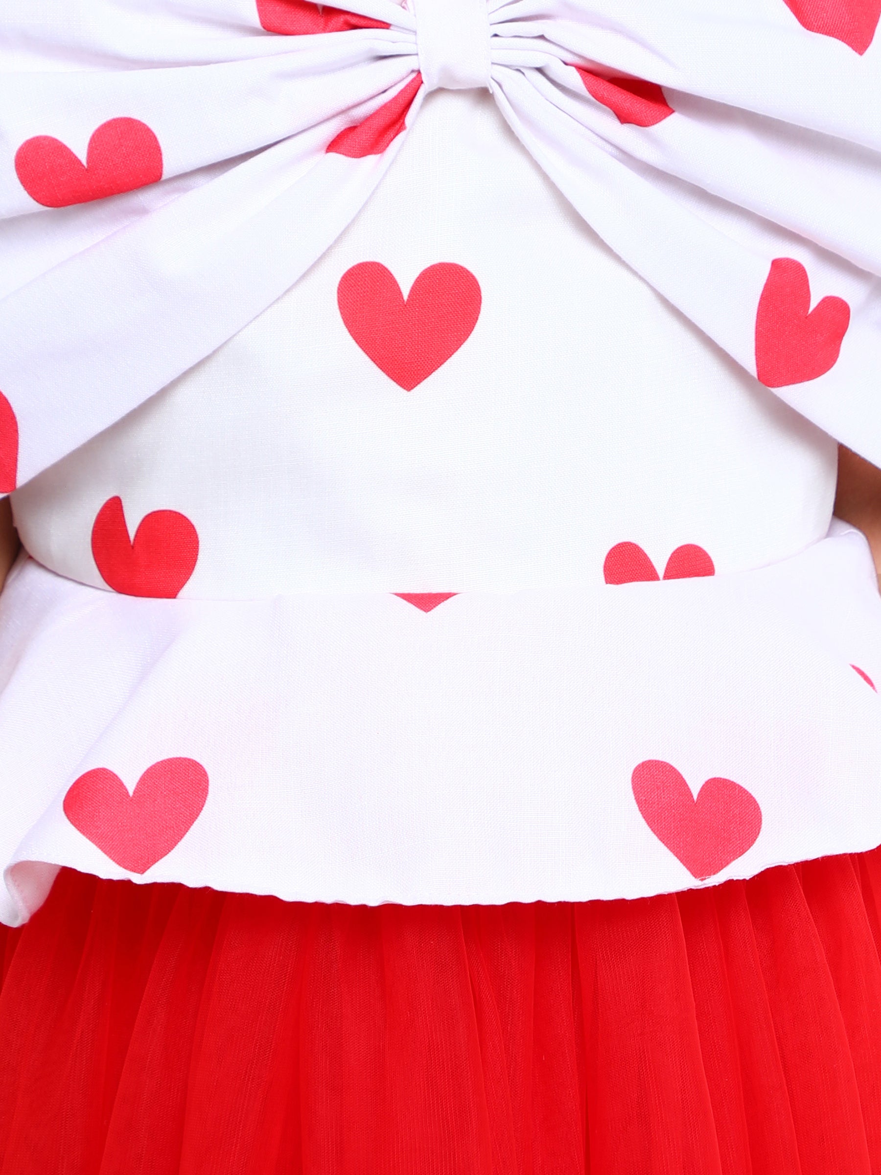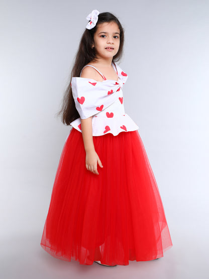 Off Shoulder Heart Print Peplum Bodice Tulle Gown Flare Child Friendly Cotton Lining Zipper back closure Adjustable Tie Back Sash Washcare : Dry Clean Only Material : Cotton Bodice And Tulle Flare Care : Dry Clean Only