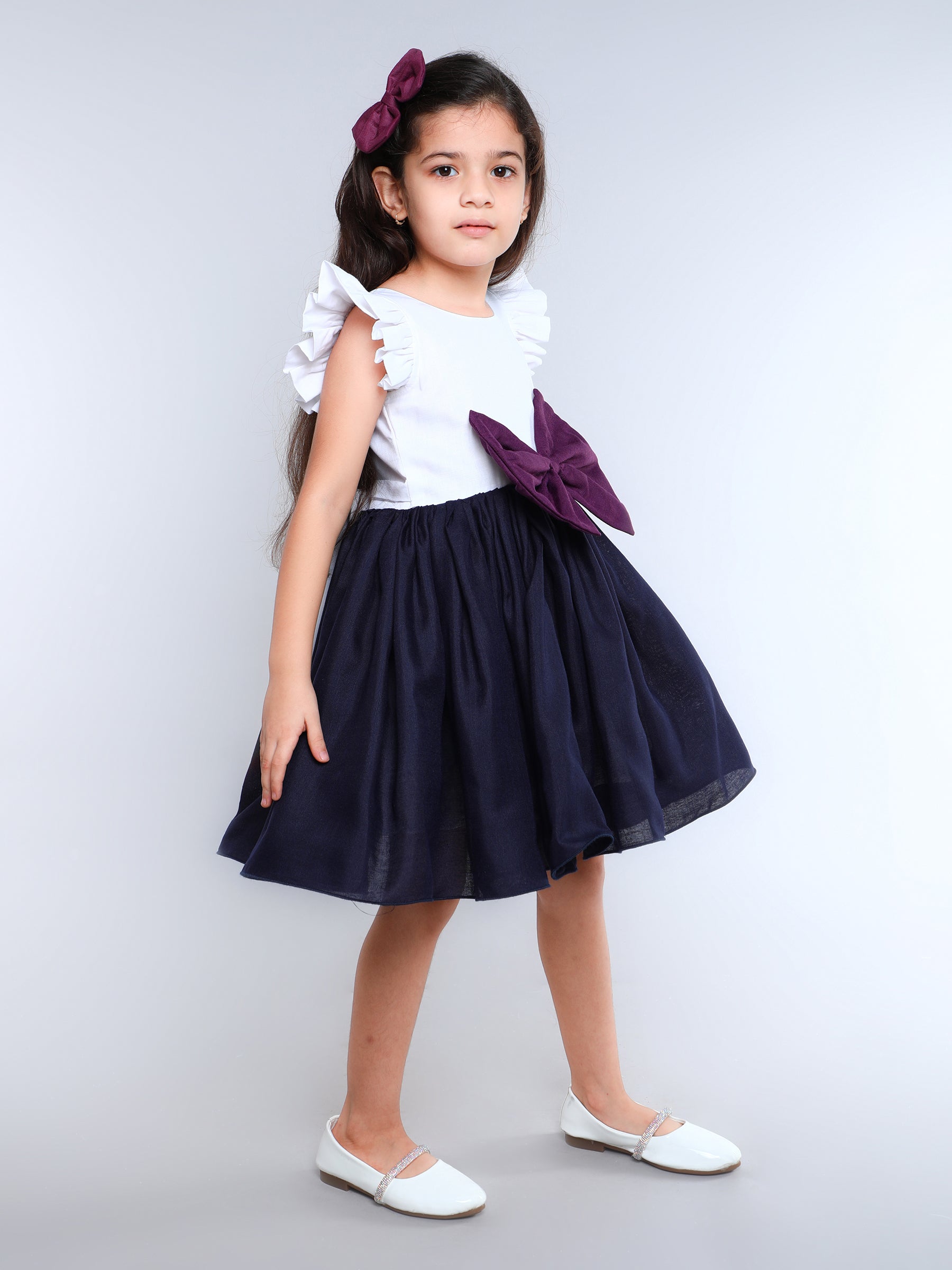 Color Block Fit and Flare Bow Dress with Matching Clip -White