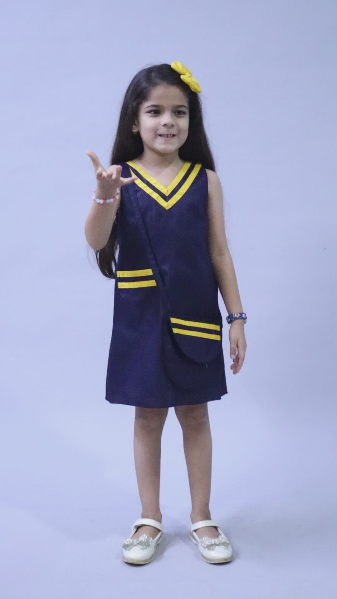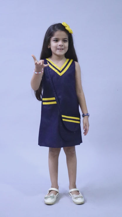 Piping Aline Dress with Sling and Matching Bow Clip -Navy Blue