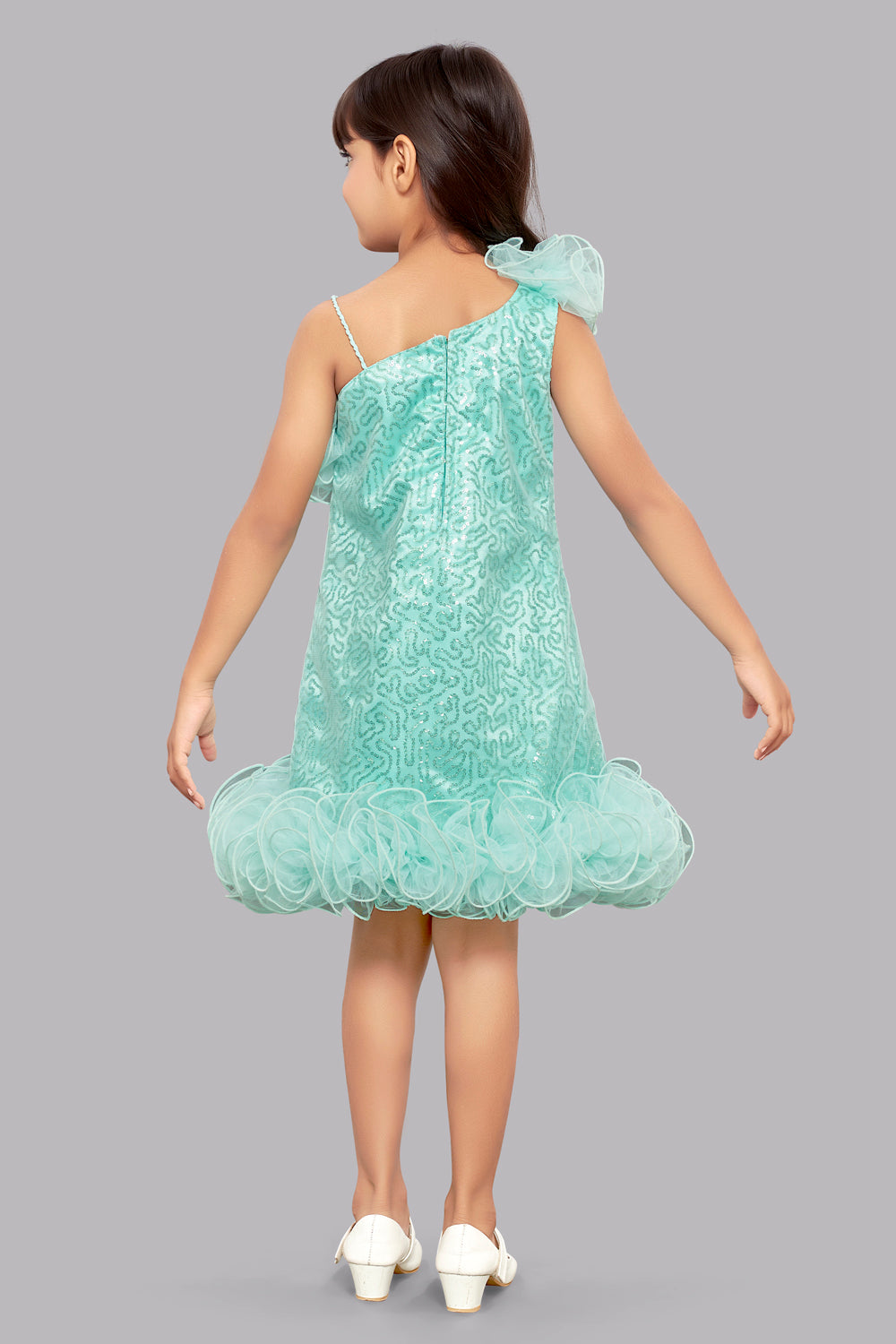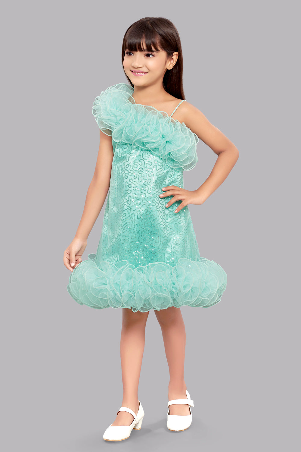 | Asymmetric Neck , Ruffled One shoulder , Sequined A-line dress , Net ruffled Hemline , sequins full overlay with net , Child Friendly Lining, Back Zip Closure ,Washcare : Dry Clean Only |
