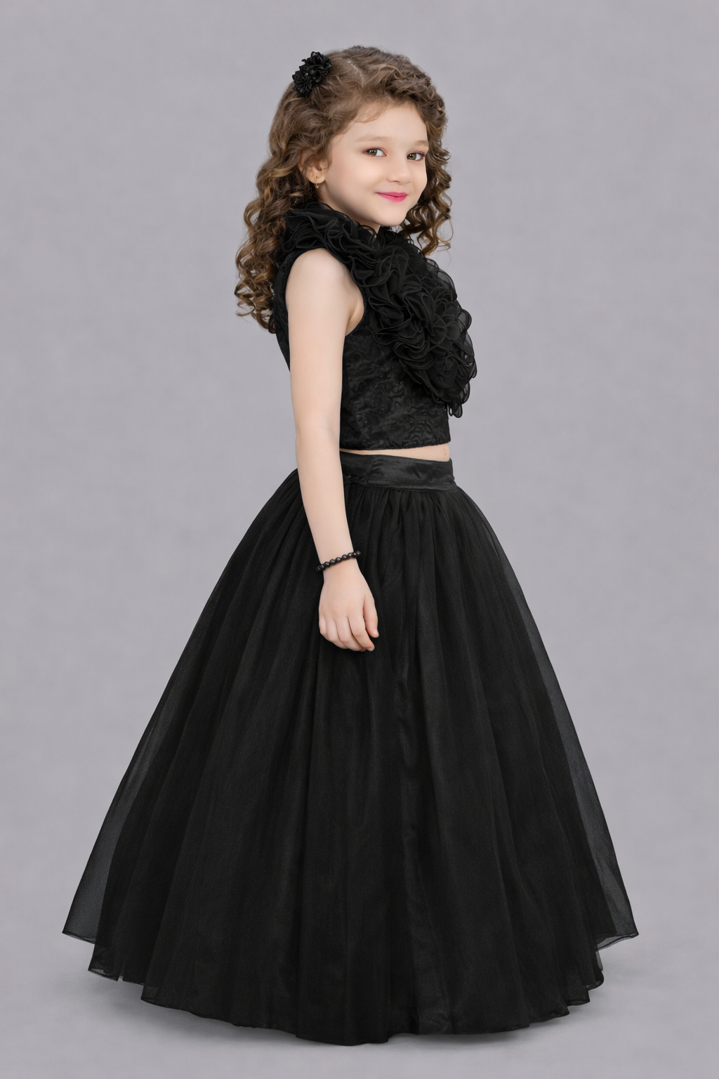 DETAILS Top: V Neck Ruffled Sleeveless Sequins Top ,Back zip Closer ,Child Friendly Lining Skirt : Full Flair Tulle Skirt , Child Friendly Lining ,Side Zip and Button closure Washcare : Dry Clean Only |