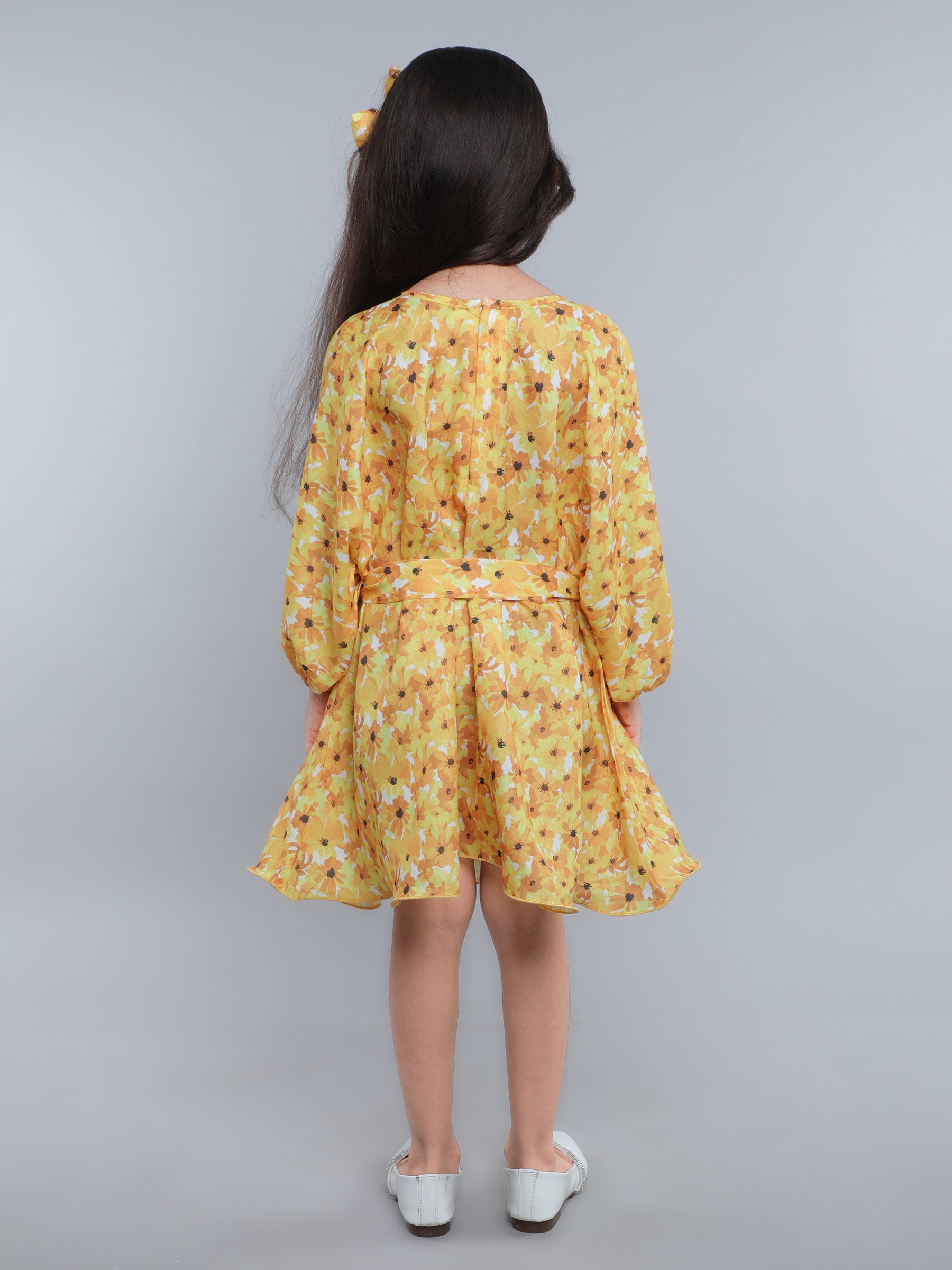 Girls Yellow Floral Printed Dress with Belt & Matching Hair Bow