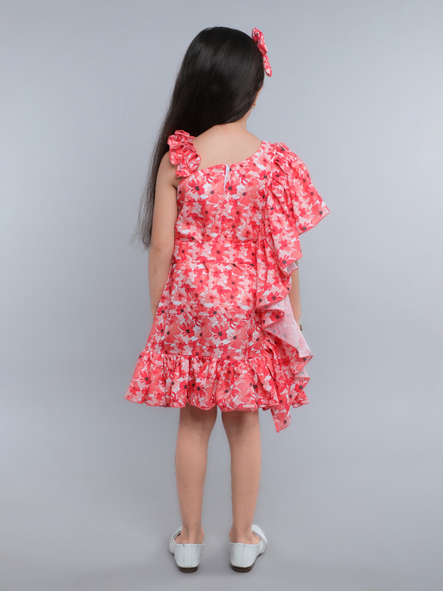One-Shoulder Blue Floral Ruffle Dress with Matching Hair Bow -Orange