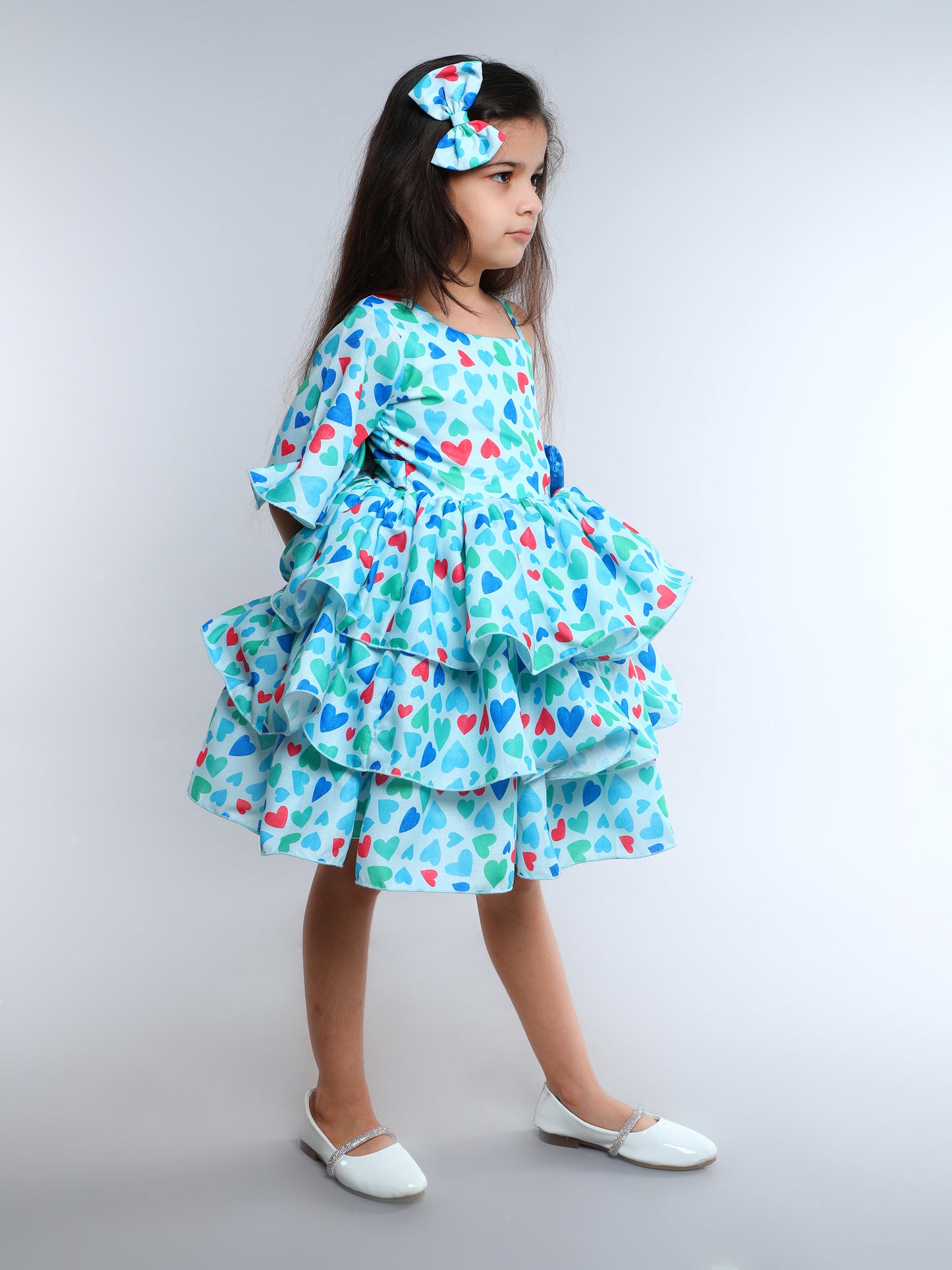 One Shoulder Heart Layered Cotton Dress With Matching Clip -Blue