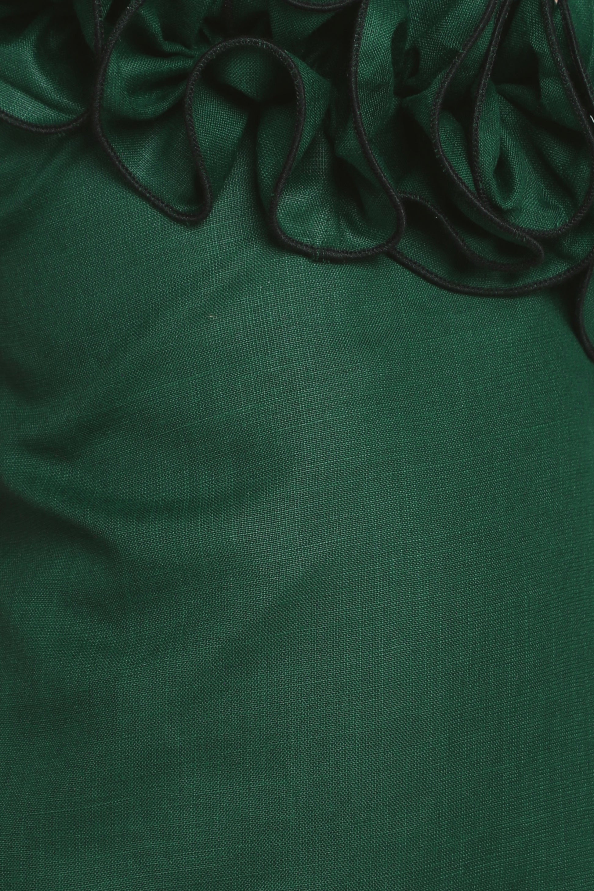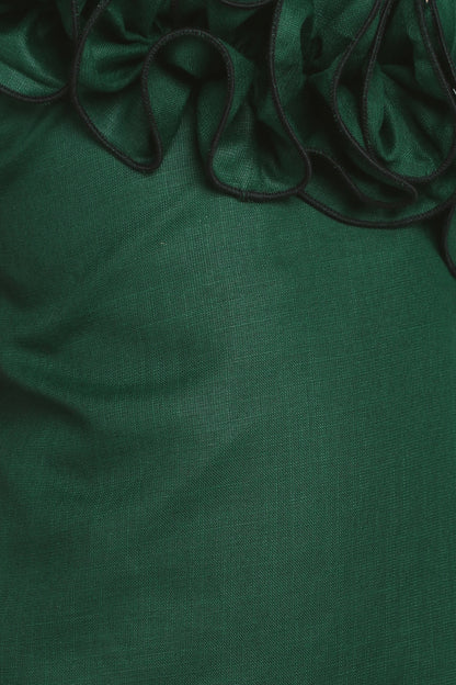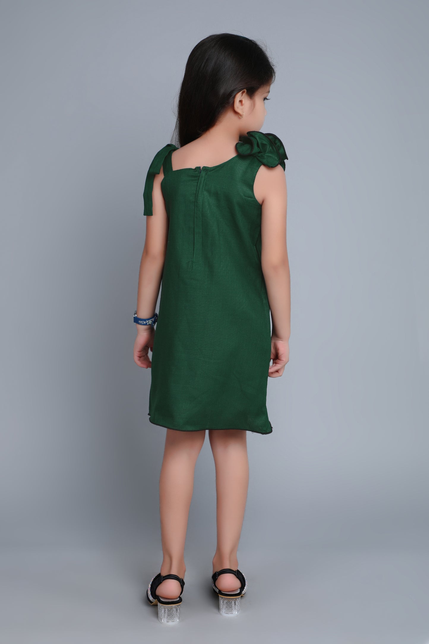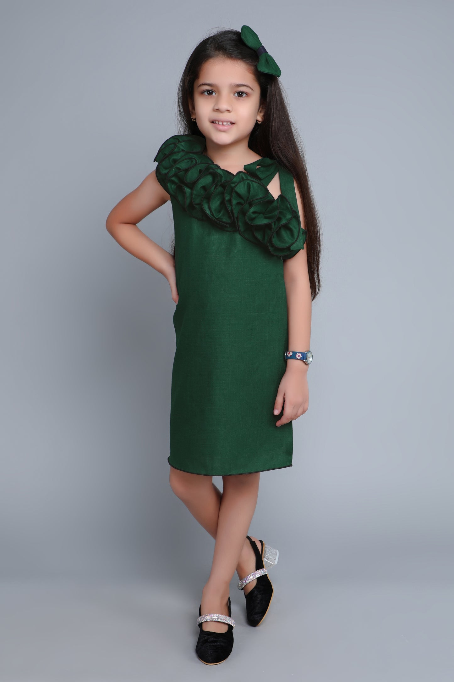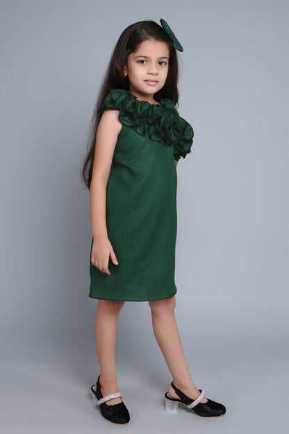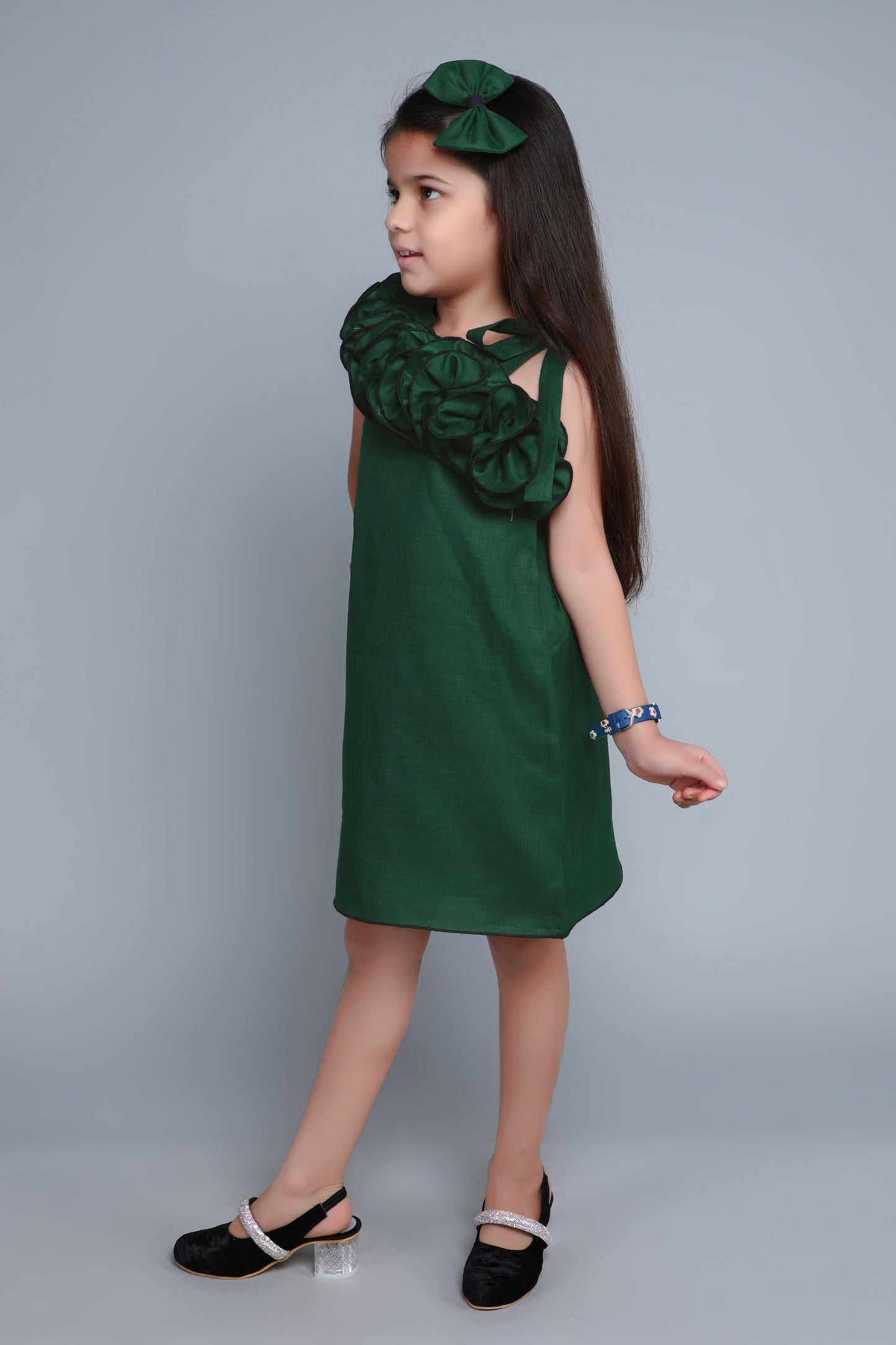One Shoulder Ruffle Aline Dress with Matching Bow Clip -Green